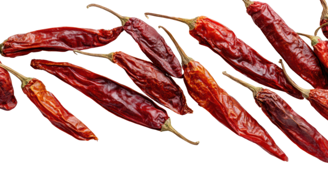 Dried red chilies arranged on a white isolated background, perfect for culinary use or food photography.