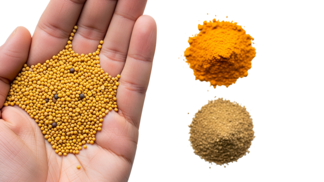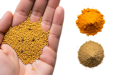 Hand Holding Yellow Mustard Seeds with Turmeric Powder and Coriander Powder on Transparent Background Studio Shot