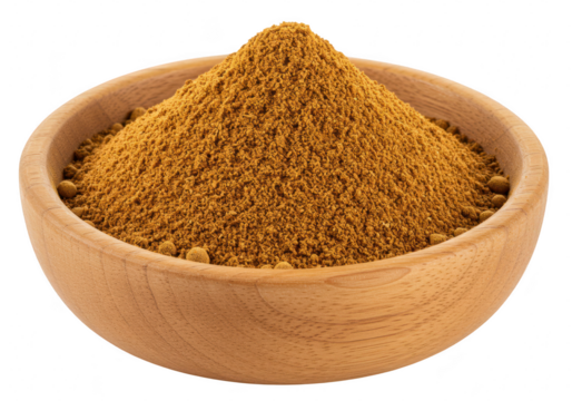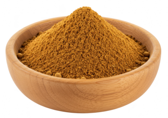 Pile of curry powder in a wooden bowl isolated on transparent background
