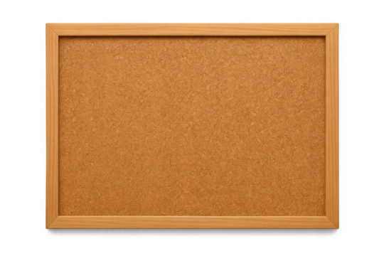 Empty cork board with a natural wooden frame, isolated on transparent background