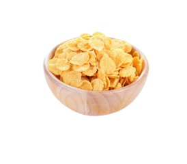 Top-down view of a bowl filled with crispy corn flakes, isolated on transparent background PNG