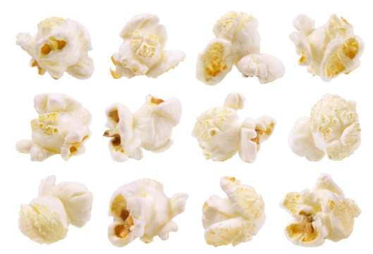 photograph capturing numerous individual corn flakes pieces scattered and floating dynamically mid-air, showcasing their crispy texture, isolated against a smooth transparent background.