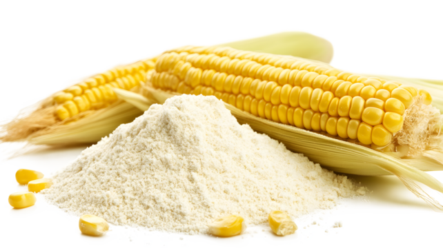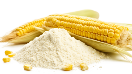 A white background with a pile of yellow corn and white flour. The corn is in the center, and the flour is spread out around it
