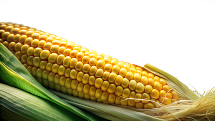 Digital rendering of ripe corn on the cob with bright yellow kernels and green leaves