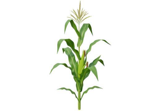 Lush corn plant standing tall with vibrant green leaves and golden tassels under sunlight