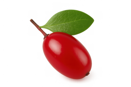 Bright cornelian cherry hanging with glossy green leaf, ripe red fruit gleaming against transparent backdrop, perfect for graphic projects