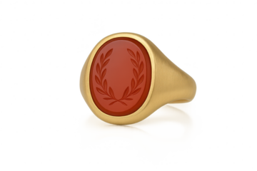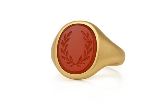 Gold signet ring with red laurel wreath, isolated on clear background.