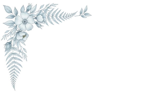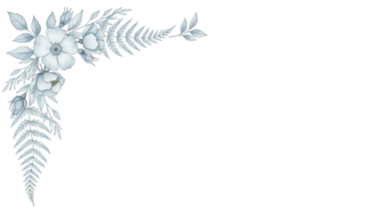 Minimal elegant watercolor floral corner border featuring wild roses and fern in pastel blue isolated on white background