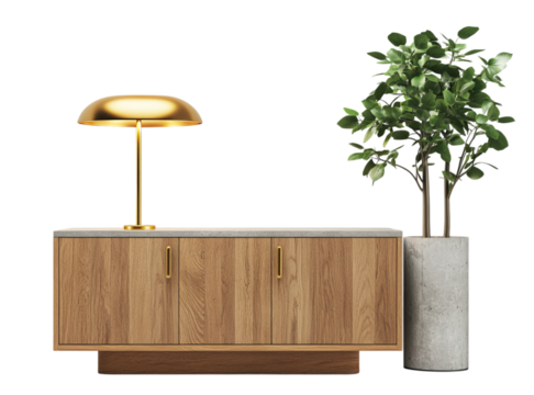 A wooden sideboard with two drawers and four doors, a plant in the right corner of it, next to an elegant floor lamp on a transparent background