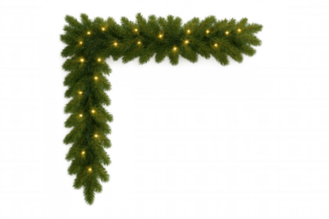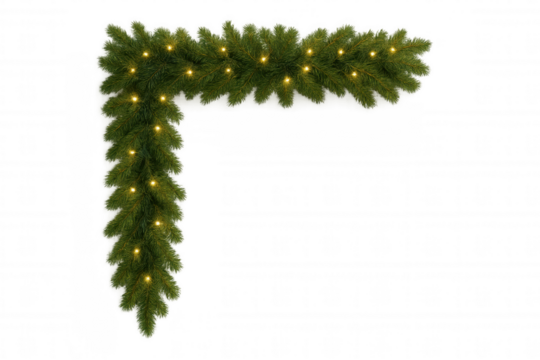 Christmas pine garland with glowing string lights framing corner, festive holiday decoration on transparent