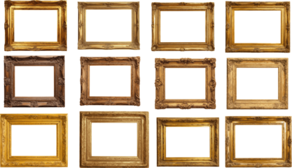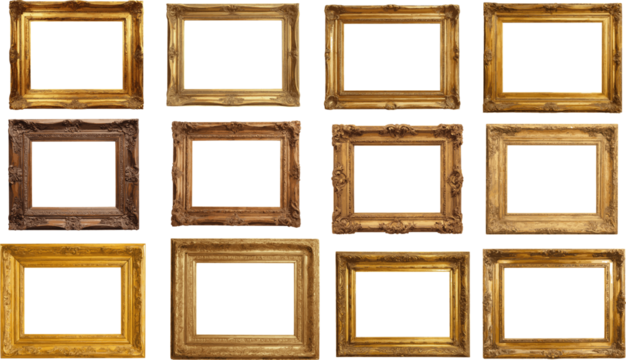 Set of old golden mirror and photo frames isolated on transparent background PNG. classic interior decoration, and elegant