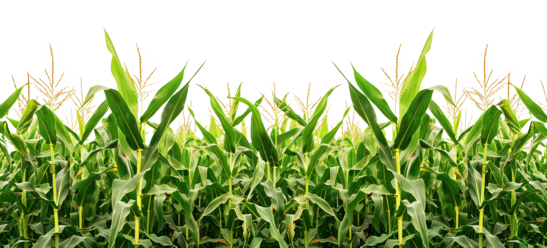 Lush green cornfield, with tall stalks and feathery tassels in full growth, cutout, PNG isolated on white or transparent background