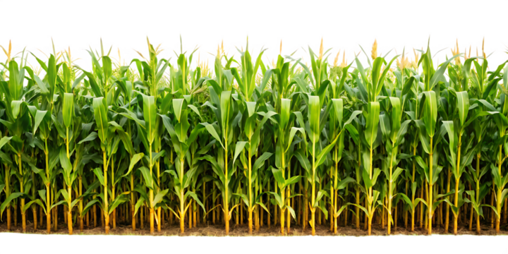 Dense green cornfield with tassels and developing ears of corn isolated on a transparent background maize