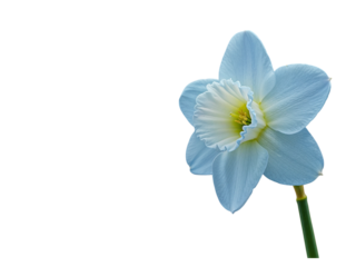 Delicate blue daffodil flower with ruffled corona and green stem isolated on transparent background