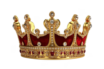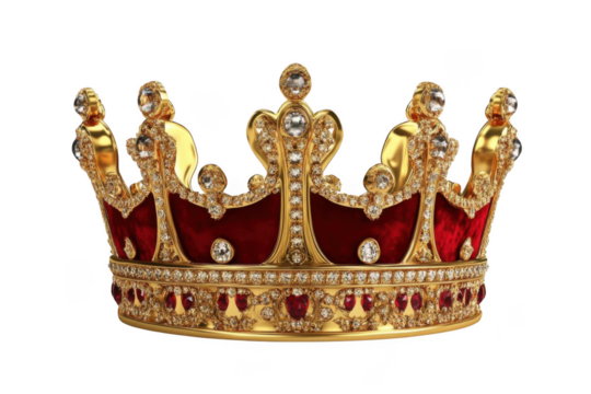 Golden royal crown with red jewels isolated PNG, king or queen coronation symbol for medieval fantasy and historical designs