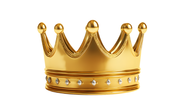 Golden crown isolated PNG on transparent background, royal symbol of power and authority for design projects and regal themes