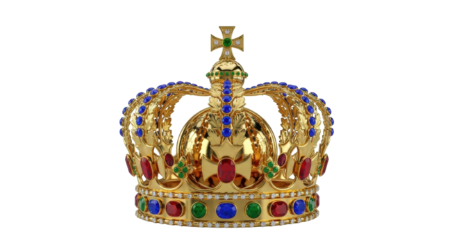 Isolated British crown with jewels, gold, a cross at the top for coronation in monarchy