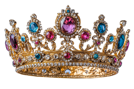 Isolated gold crown for royalty, beauty, or celebration, coronation symbol for design use