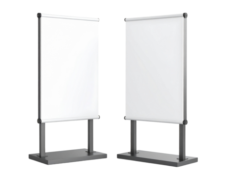 3D Realistic floor standing display mockup with metal base and leather. Blank portable vertical info white placard sign holder stand for presentation poster, banner, ads, products or exhibition info