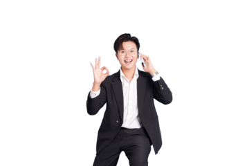 Satisfied Communication: A confident businessman, dressed in a sharp suit, engages in a phone call while flashing an 'okay' hand gesture, symbolizing approval and agreement.