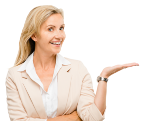 Happy businesswoman, portrait and hand palm for offer or promo deal isolated on png background. Transparent, smile or mature person with gesture for advertising, marketing or sale presentation