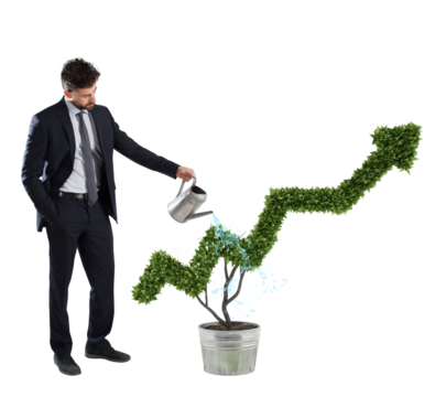 Businessman watering a plant that grows like an arrow. Concept of growing of company economy.
