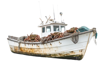 Crab fishing boat loaded with traps and fresh crabs ,Isolated on transparent background