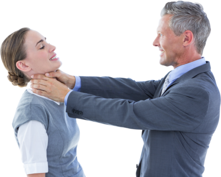 Digital png photo of caucasian businessman with hands on woman neck on transparent background