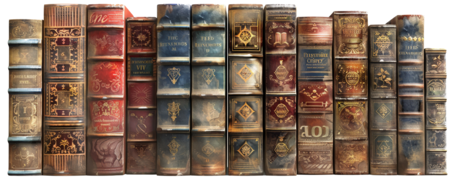 A row of old books with gold lettering on the spines. The books are lined up in a row and are of different sizes, isolated on transparent background