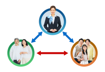 シニア夫婦と子育て家族の連携をサポートする女性スタッフの実写アイコンを使用した相関図の背景透過PNG(1人ずつの全身PNG画像も販売しております。↓作成者リンクから「PNG」で検索してください)