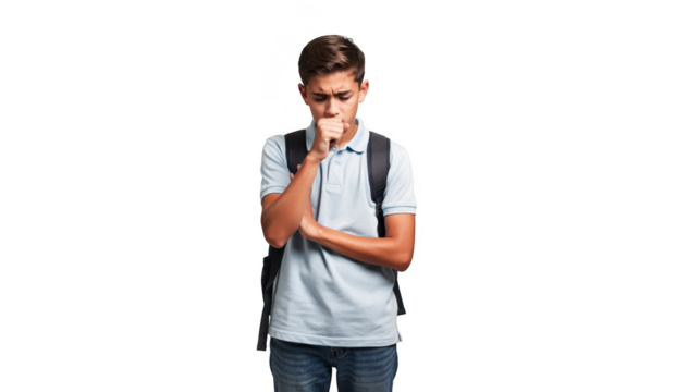 Student in casual uniform coughing into bent elbow in a school corridor isolated against white background emphasizing public health awareness in educational settings.