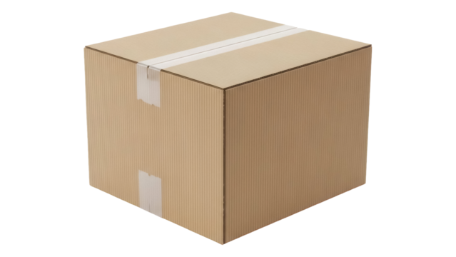 Cardboard box isolated PNG, brown corrugated container with tape for shipping and storage, package for delivery on transparent background