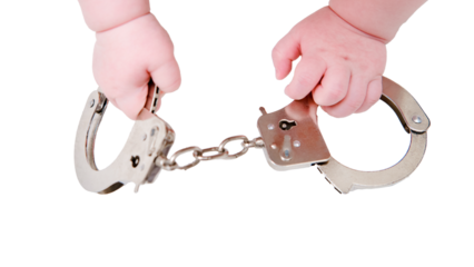 Baby hand and handcuffs, close-up, isolated on a white background. Children fingers and an object on a white background