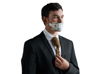 Businessman, bribe and money tape for corporate fraud, corruption or isolated on transparent png background. Noose for laundering funds, silent or financial crime in accounting firm for personal gain