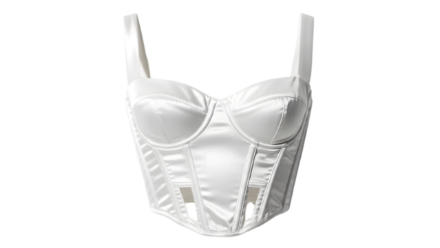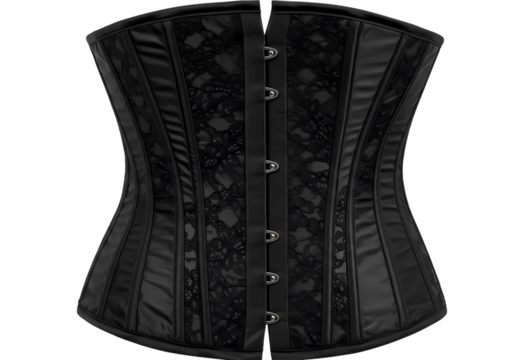 Black leather corset with lace trim and white buttons, portraying gothic fashion style, intimate apparel for women, transparent background