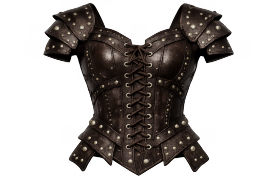 Dark brown studded leather corset armor for female warrior, fantasy costume with shoulder pauldrons and lacing, transparent background