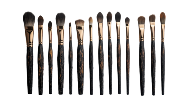 A collection of professional makeup brushes arranged neatly on a white background. transparent background