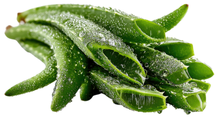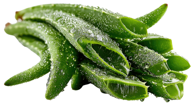 Freshly Cut Aloe Vera: A close-up shot presents freshly cut aloe vera leaves, glistening with droplets of moisture, ready for skincare, wellness or cosmetic use.