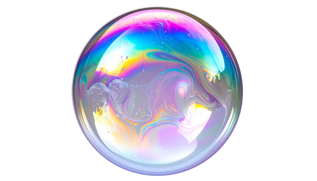 A close-up of a soap bubble with iridescent colors on a black background