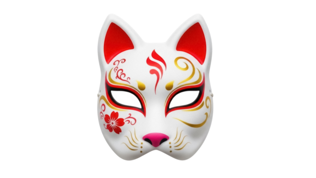 Japanese fox mask isolated PNG on transparent background, traditional kitsune mask with red and gold decorations for festivals and cosplay
