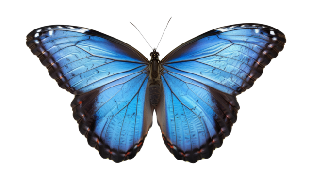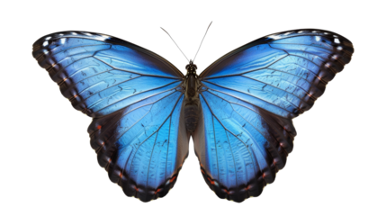 a blue morpho butterfly with its wings spread wide, Isolated on white background.