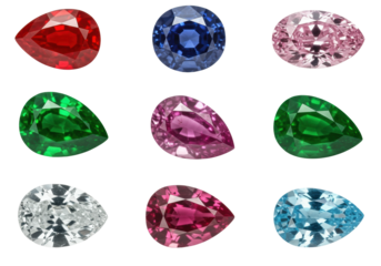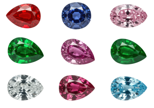Nine vibrant, perfectly faceted gemstones (ruby, sapphire, diamond) in a symmetrical grid on a transparent background with soft shadows, ample copy space, concept of luxury and preciousness