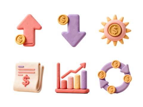 Financial Elements: A vibrant and creative clay-modeled composition featuring various financial symbols, including up and down arrows, sun, financial statement, growth chart, and a recycling symbol.