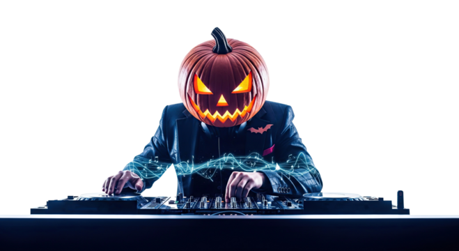 Halloween DJ with Pumpkin Mask Performing at a Party, isolated on white background, png