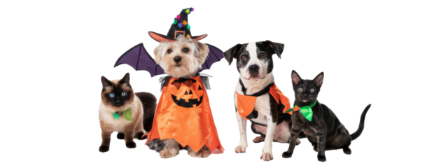 halloween pets: dogs and cats in costume on white background.