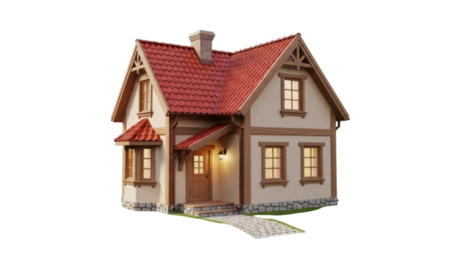 Cozy winter wooden house with glowing windows on transparent background