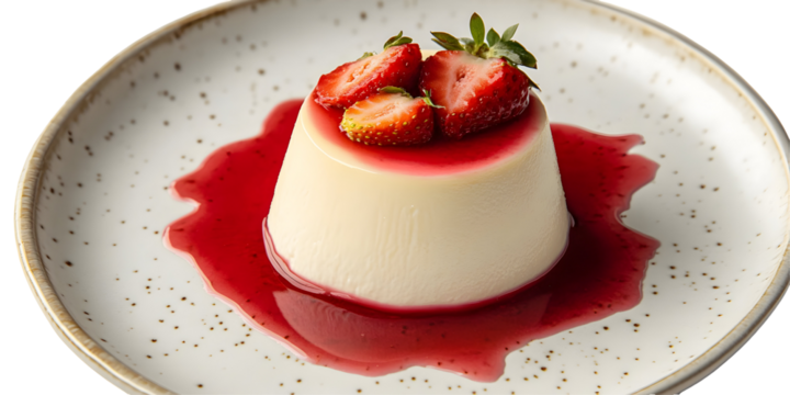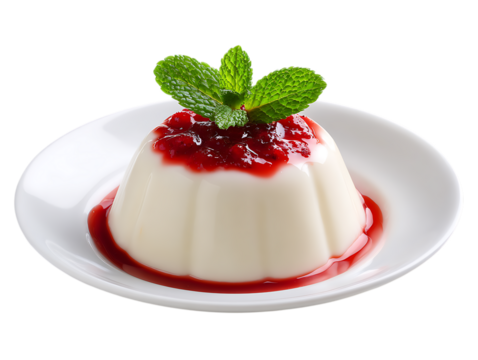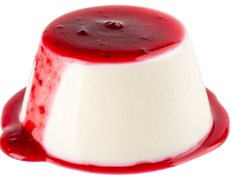 Delicious panna cotta dessert with red berry sauce, isolated on transparent background, high detail, close up