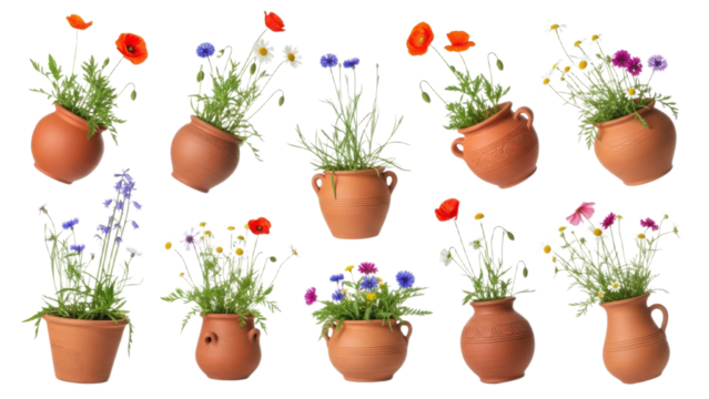 Assortment of Vibrant Wildflowers in Terra Cotta Pots on White Backdrop Depicting Garden Decor and Natural Beauty