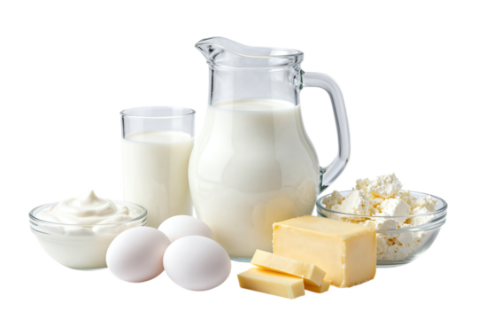 Fresh dairy products and eggs arranged together