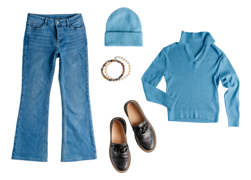 Top view of set or collection of warm cozy autumn winter clothes of blue casual outfit flare jeans, sweater, warm knitted hat, leather loafers and accessories bracelet isolated on white background
